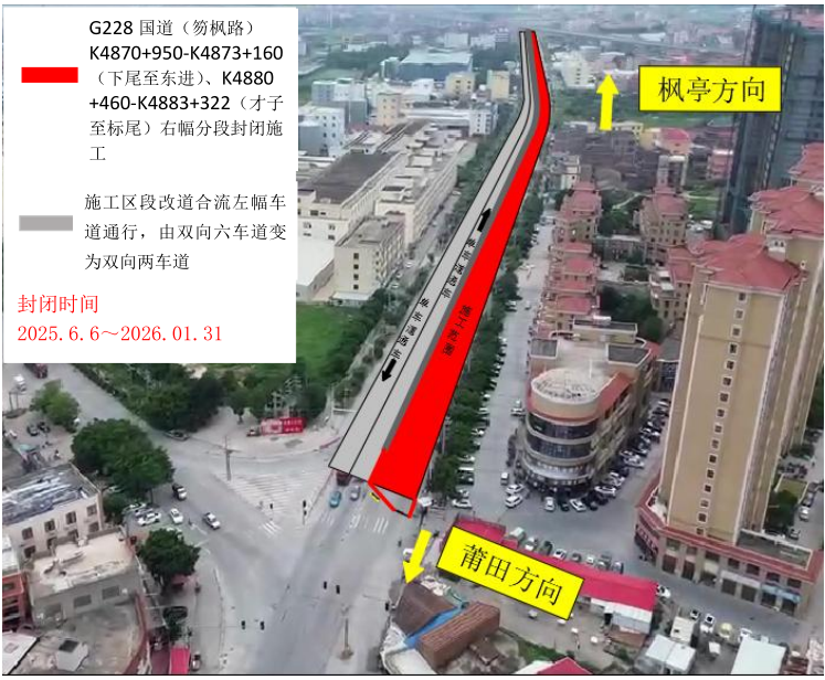 因G228线荔城区北高镇冲沁村-仙游县枫亭镇辉煌村部分路段路面改造提升工程(大修)(城厢段)占道施工需要,为保证施工期间道路交通安全、畅通,根据《中华人民共和国道路交通安全法》第三十九条规定,决定对笏枫路城厢区(灵川镇)丹东线交叉口至城厢区(东海镇)与仙游县(枫亭镇)交界处路段实行临时交通管制。具体通告如下: