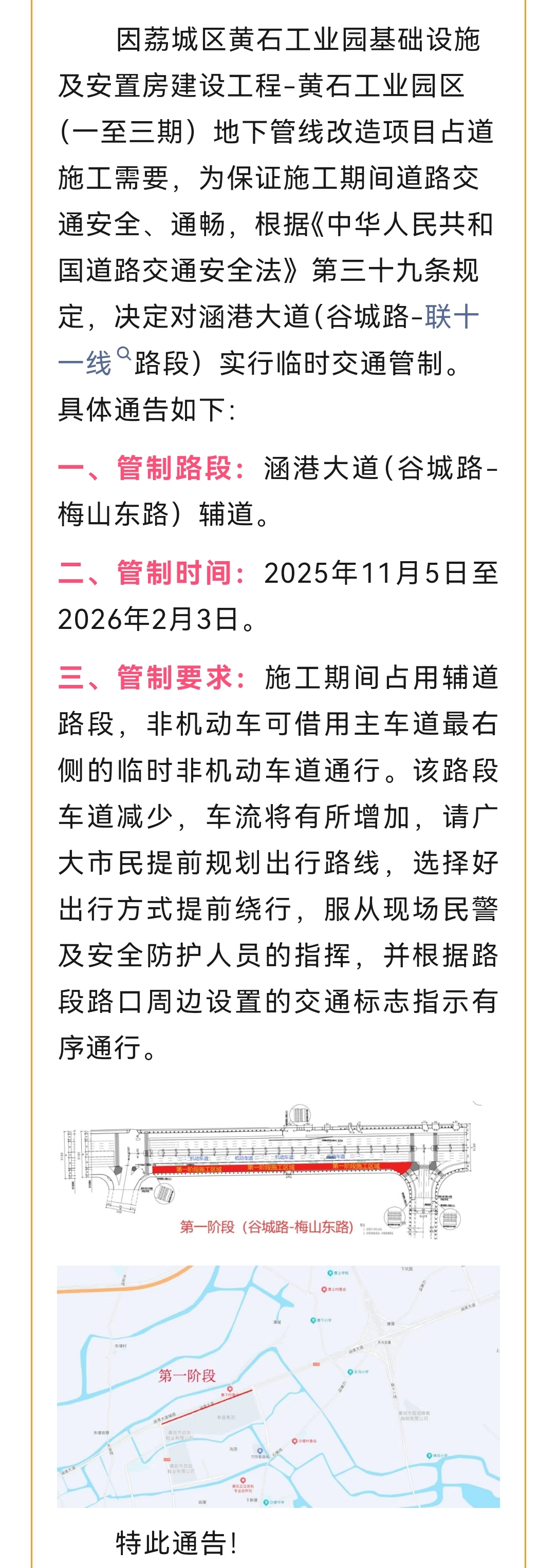 莆田市公安局交通管理支队关于涵港大道占道施工交通管制的通告