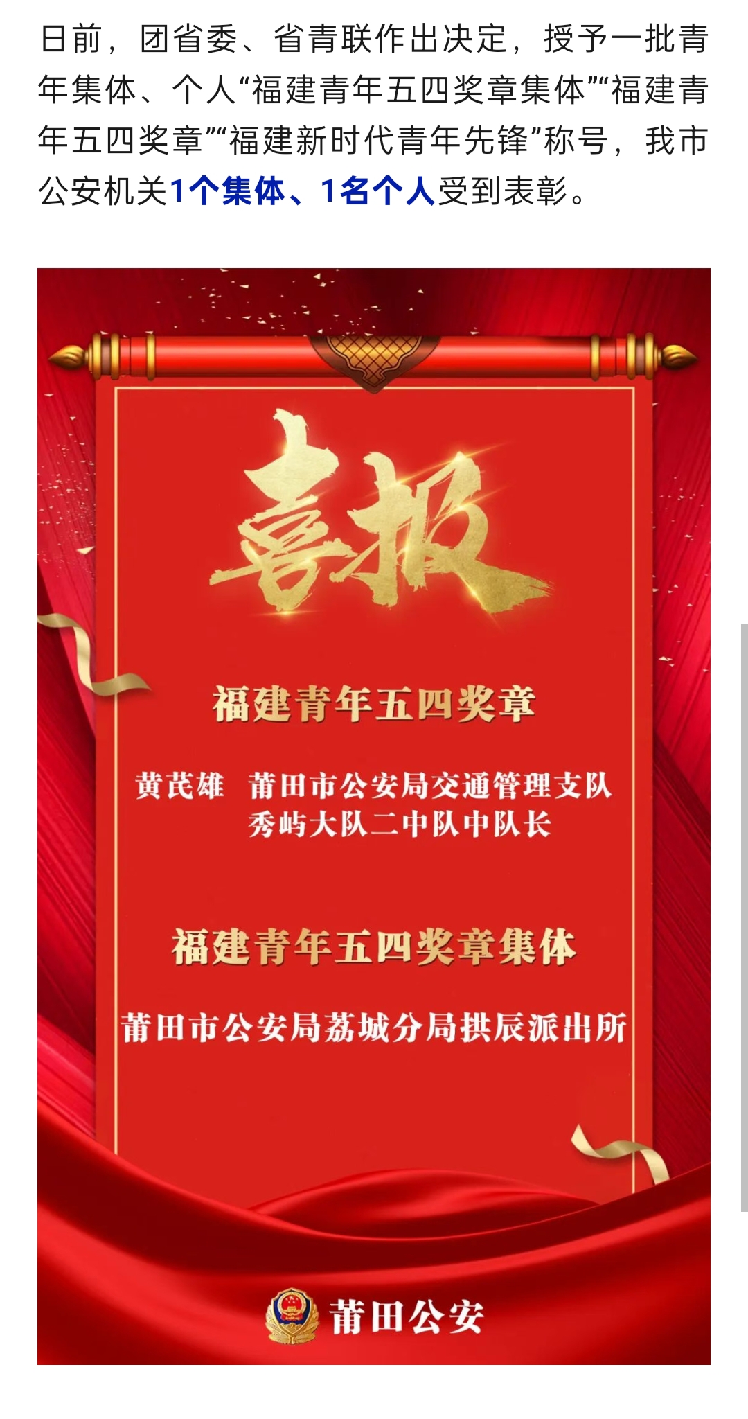 喜报!莆田公安荣誉+1+1