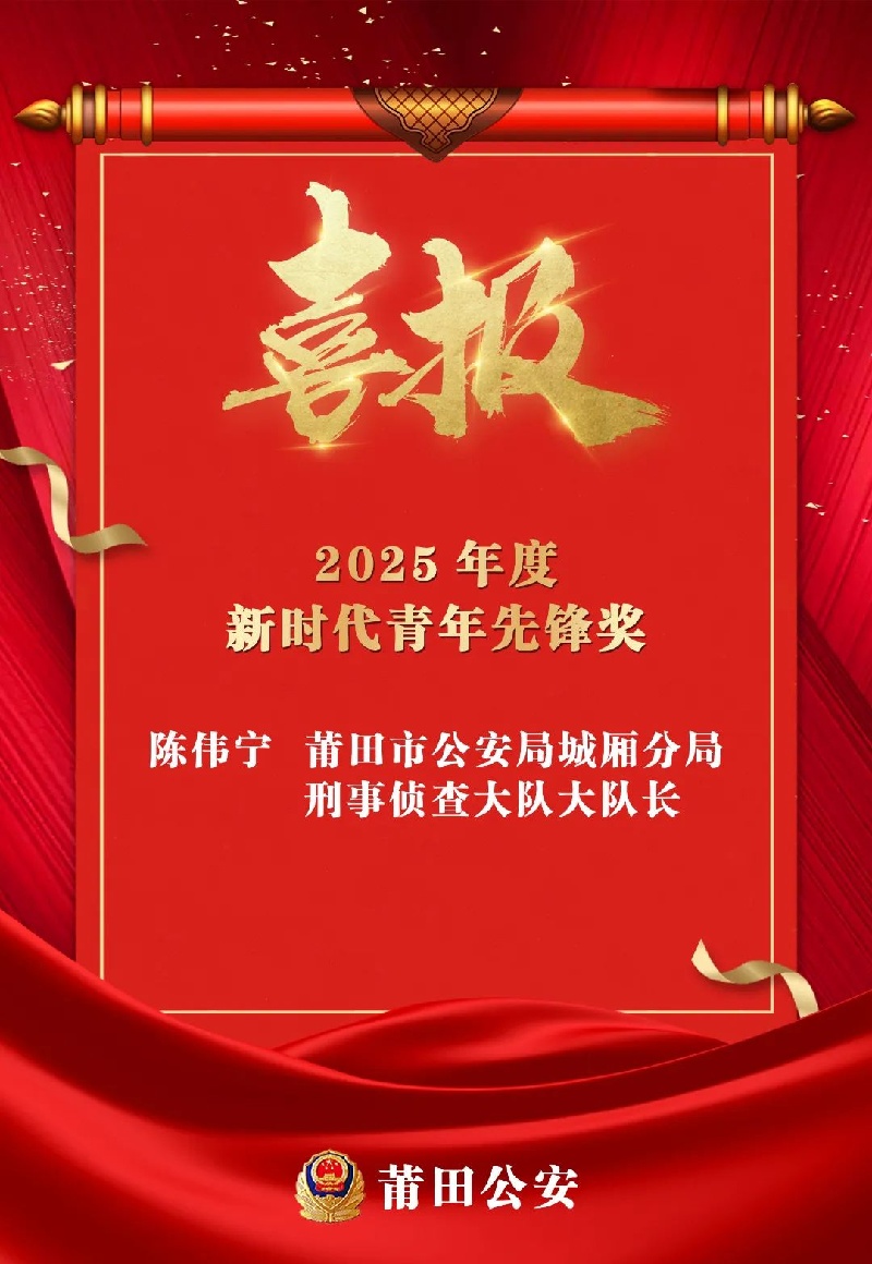 在五四青年节来临之际,共青团中央、全国青联公布了2025年度中国青年五四奖章暨新时代青年先锋奖获奖名单。其中,莆田市公安局城厢分局刑事侦查大队大队长陈伟宁荣获“2025年度新时代青年先锋奖”。