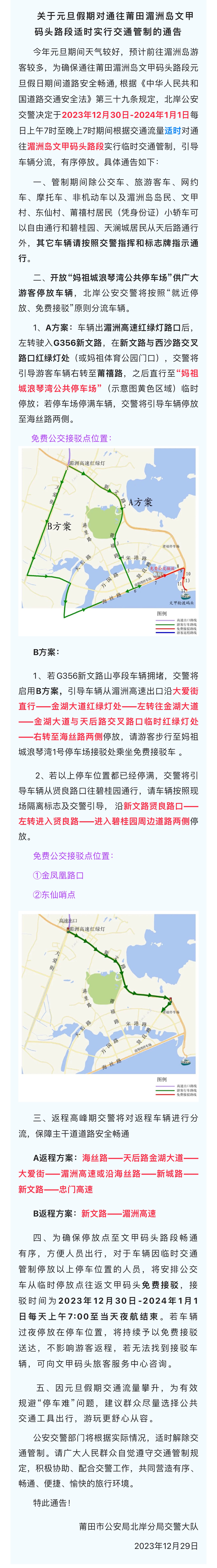 关于元旦假期对通往莆田湄洲岛文甲码头路段适时实行交通管制的通告