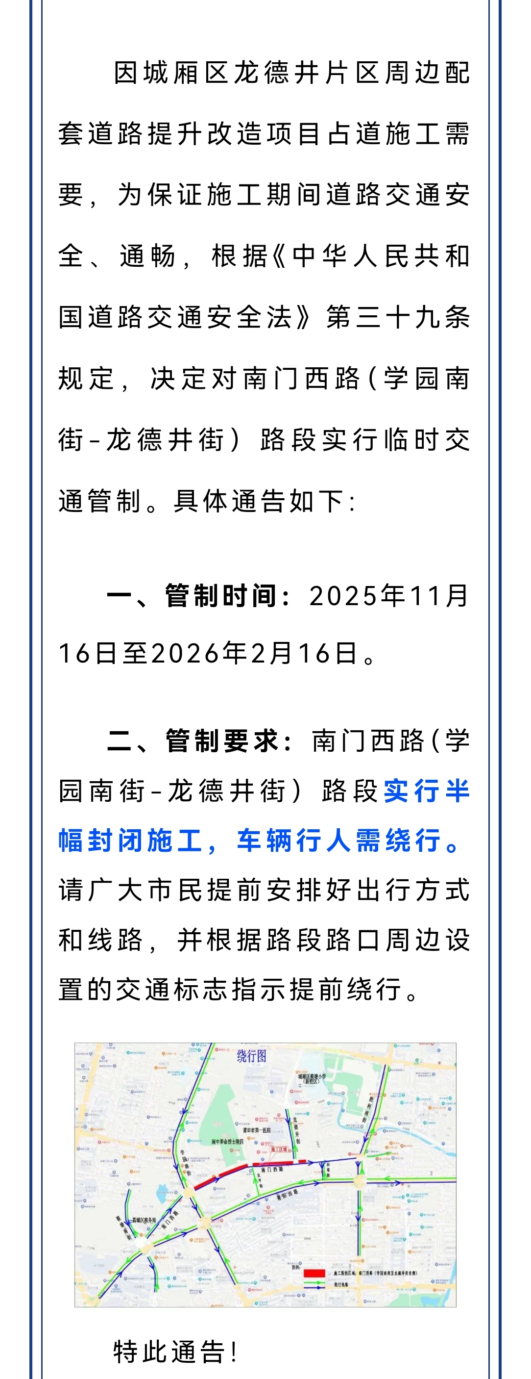 关于南门西路(学园南街-龙德井街)路段占道施工交通管制的通告