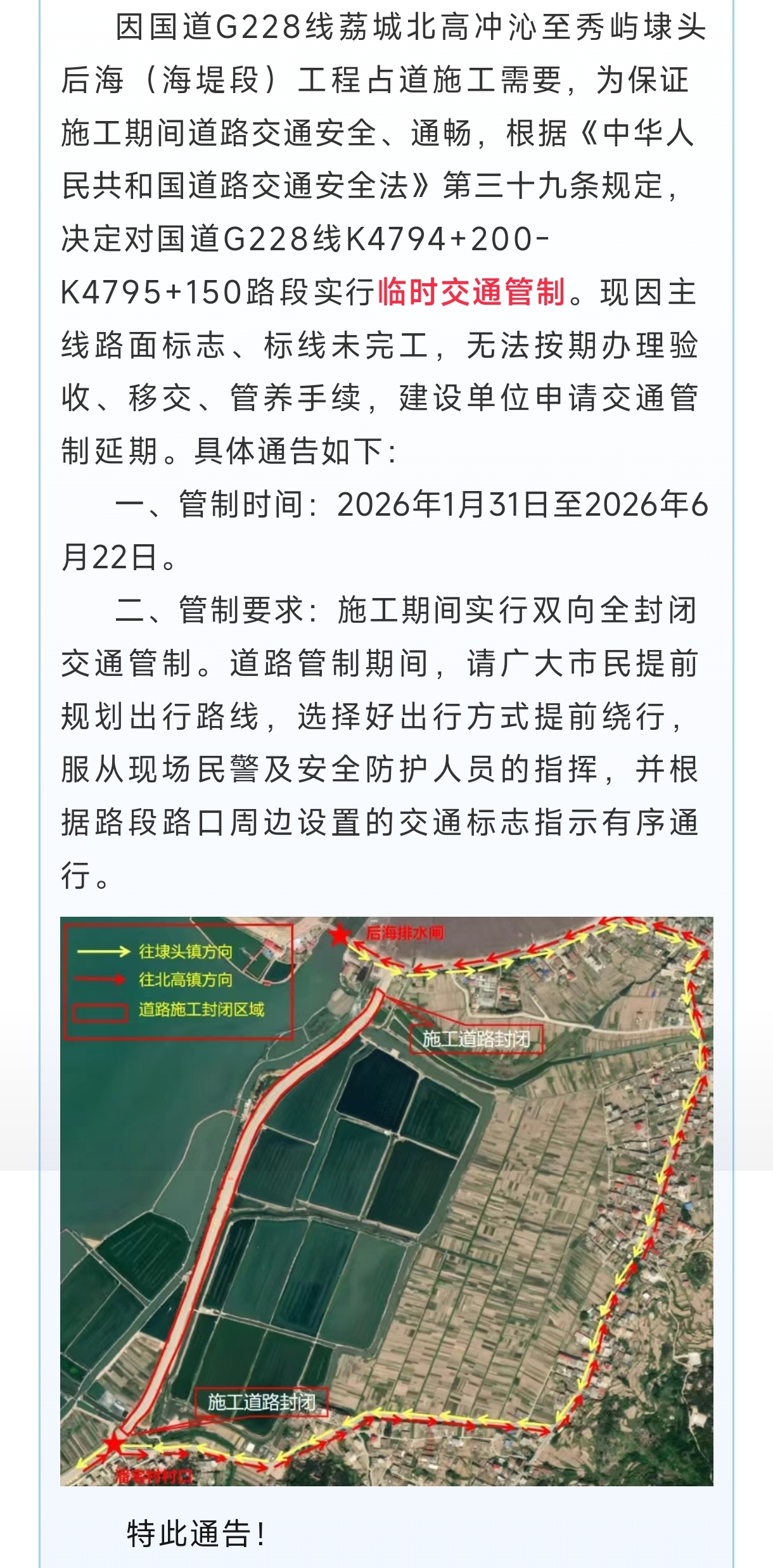 莆田市公安局交警支队关于国道G228线K4794+200-K4795+150路段占道施工交通管制延期的通告