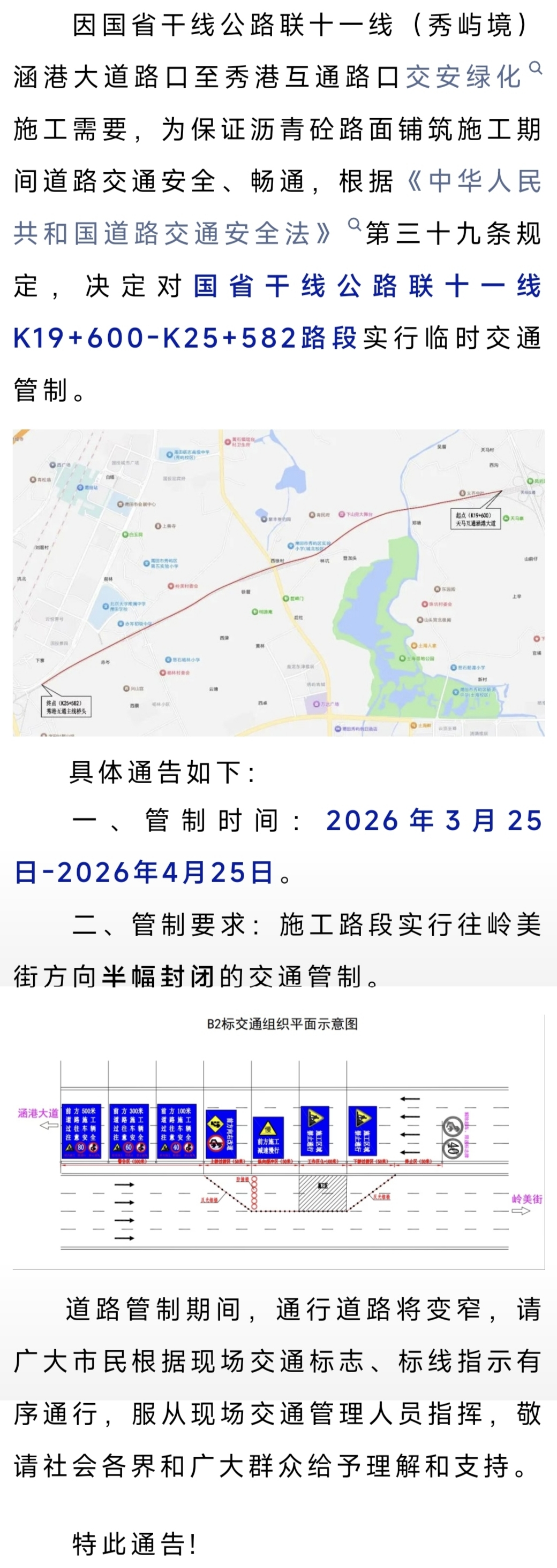 关于联十一线(秀屿境)涵港大道路口至秀港互通路口交安绿化占道施工交通管制的通告